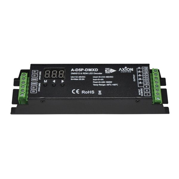 The Axion Lighting 5 Channel DMX Decoder offers a perfect way to control single color, tunable white, RGB, RGBW or even RGBWW fixtures. These are often found with full color RGB and two different white LEDs to give the best of both worlds.