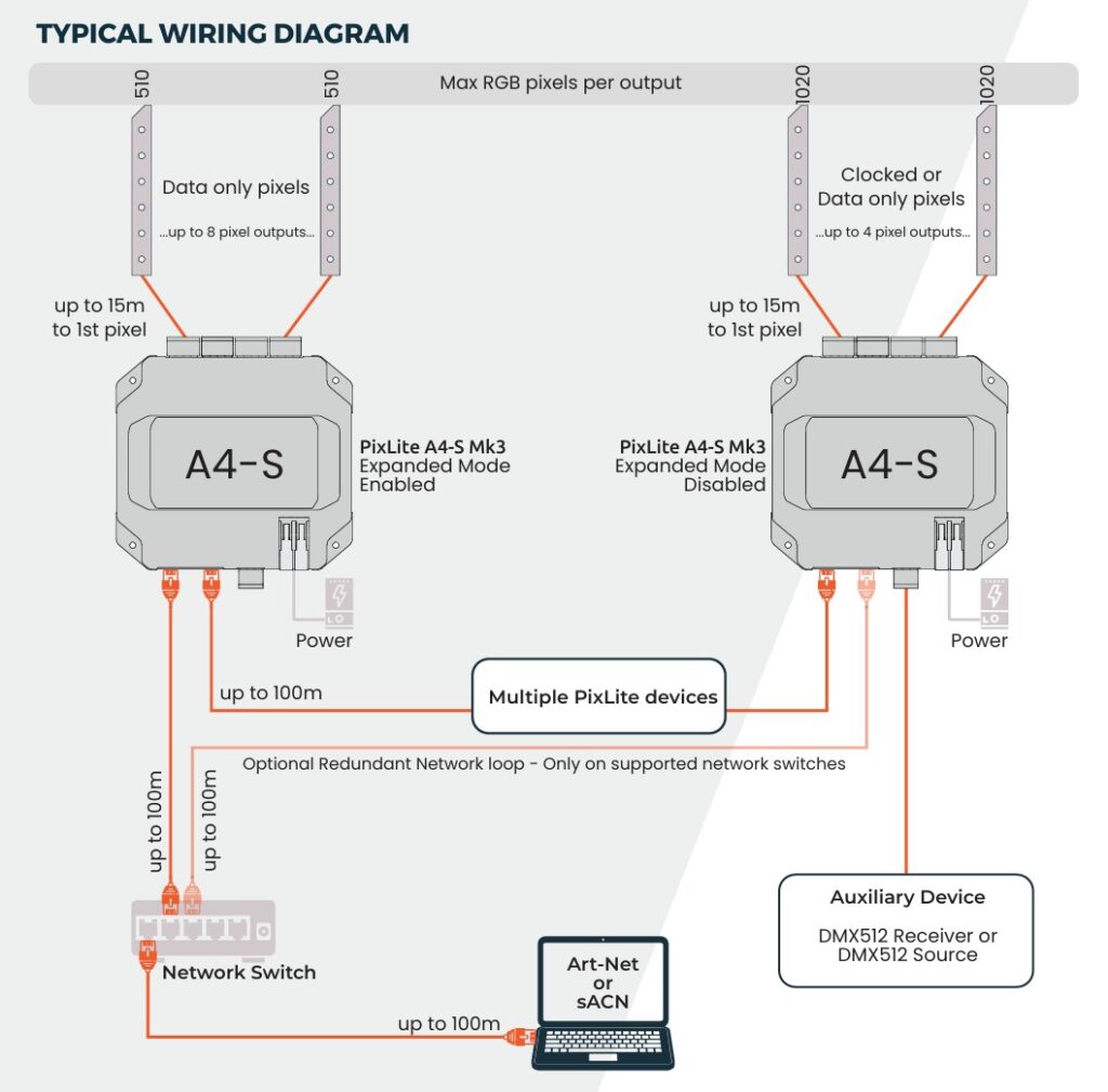 Simplify your network infrastructure by daisy chaining PixLite controllers together. Maintain high network reliability by optionally connecting a redundant Ethernet line to any loop with a suitable switch.