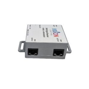 The Axion Lighting DMX Signal splitter and amplifier takes a single DMX512 input and provides two separate outputs. The signal booster can be placed any where in the DMX signal line and will bring any signal drop up to the full EIA-485 voltage level, allowing you do drive longer cable runs or additional DMX equipment like LED decoders. Since it is a 1×2 splitter you can also divert the signal to multiple locations from a single input.