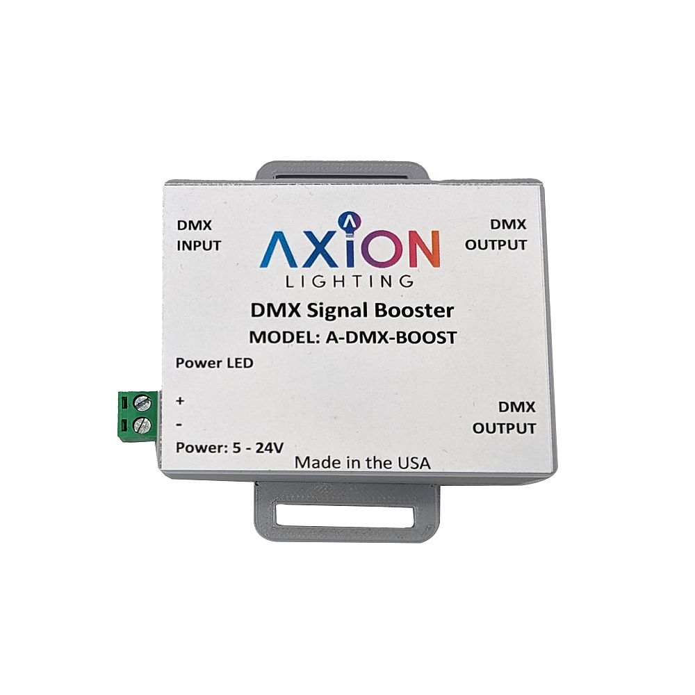 The Axion Lighting DMX Signal splitter and amplifier takes a single DMX512 input and provides two separate outputs. The signal booster can be placed any where in the DMX signal line and will bring any signal drop up to the full EIA-485 voltage level, allowing you do drive longer cable runs or additional DMX equipment like LED decoders. Since it is a 1×2 splitter you can also divert the signal to multiple locations from a single input.