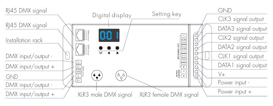 - Short press the M key, when it displays 001-512 it is now in DMX decode mode.