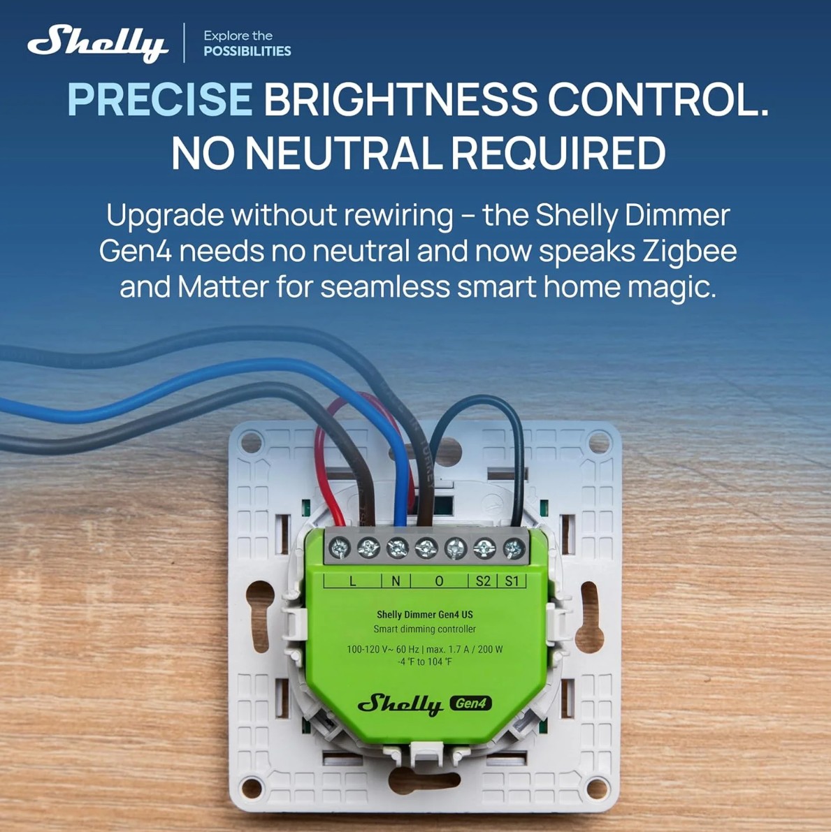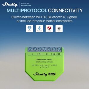 Shelly Dimmer Gen4 US (the Device) is exclusively designed for the US market. It is a single-channel smart dimming controller which allows remote control of dimmable lights and dimming drivers through a mobile phone, tablet, PC, or home automation system. The Device supports Wi-Fi, Bluetooth and Zigbee connectivity. It can work standalone in a local Wi-Fi network or it can also be operated through cloud home automation services. It can be accessed, controlled, and monitored remotely from any place where the User has internet connectivity, as long as it is connected to the Internet. Shelly Dimmer Gen4 US has an embedded Web Interface which can be used to monitor and control the Device, as well as adjust its settings. The Device can be used as trailing edge dimmer switch, only with neutral wire.